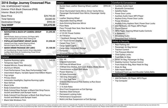 2016 Dodge Journey Crossroad Journey Crossroad, 4D Sport Utility, 3.6L V6 24V VVT, 6-Speed Automatic, AWD, Pitch Black Clearcoat, Black Leather, 5-Year SiriusXM Traffic Service, 5-Year SiriusXM Travel Link Service, 8.4 Touchscreen Display, ATC w/3-Zone Temperature Control, Cargo Net, Crossroad Equipment Group, Cruise control, Front & Rear Aimable LED Lamps, Front Passenger Forward Fold Flat Seat, Garmin Navigation System, Heated Front Seats, Heated Steering Wheel, Interior Observation Mirror, Leather Seats w/Sport Mesh Inserts, Light Gray Accent Stitching, Navigation & Back-Up Camera Group, Overhead Console, ParkSense Rear Park Assist System, ParkView Rear Back-Up Camera, Passenger Assist Handles, Passenger In Seat Cushion Storage, Popular Equipment Group, Power 4-Way Driver Lumber Adjust, Power 6-Way Driver Seat, Premium Door Trim Panel w/Stitching, Quick Order Package 28V, Radio: 8.4, Radio: 8.4 Navigation, Remote keyless entry, Remote Start System, Security Alarm, SiriusXM Traffic, SiriusXM Travel Link, Sun Visors w/Illuminated Vanity Mirrors, Universal Garage Door Opener.