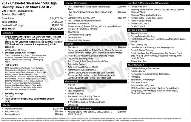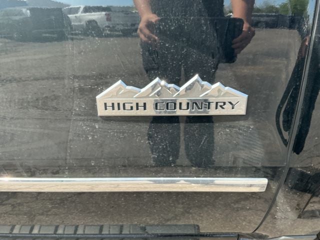 - High Country includes High Country brushed metal sill plate, (AN3) front full-feature leather-appointed bucket seats, (KQV) heated and vented seats, (K4C) Wireless Charging, (B58) color-keyed carpeted floor mats, (D07) center floor console, (UQA) Bose sound system, (NZJ) 20" chrome wheels, (IO6) MyLink 8" Diagonal Color Touch audio system with Navigation, (QSS) P275/55R20 all-season, blackwall tires, (UD5) Front and Rear Park Assist, (VB5) body-color front bumper, (VT5) body-color rear bumper, unique chrome grille, (V76) Black recovery hooks, (VQZ) polished exhaust tip, LPO, (CTD) cargo tie downs, dealer-installed (4), (BVQ) chrome assist steps, (Y86) Enhanced Driver Alert Package (which includes (UEU) Forward Collision Alert, (UHX) Lane Keep Assist, (TQ5) High Beam assist, (UHY) Low Speed Forward Automatic Braking and safety alert seat), (UVD) heated steering wheel, (JF4) Power Adjustable Pedals and (JL1) trailer brake controller