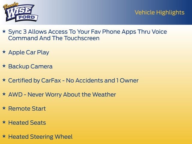 - SYNC 3 Communications & Entertainment System -inc: enhanced voice recognition communications and entertainment system, 8" LCD capacitive touchscreen in center stack w/swipe capability, AppLink, 911 Assist, Apple CarPlay and Android Auto compatibility and 2 smart-charging USB ports